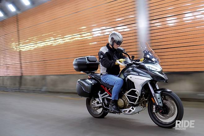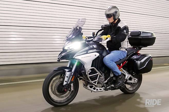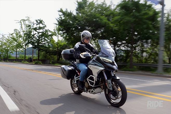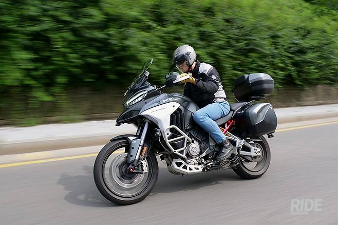조금 차량 통행이 뜸해지는 구간에 들어서 스로틀을 열어주자 V4 그란투리스모 엔진의 진면모가 드러난다. 꾸준하게 뿜어지는 파워가 거대한 차체를 쭉쭉 밀어주는 덕분에 눈 깜짝할 새에 규정 속도를 넘길 정도. 여기에 주행모드를 스포츠로 바꿔주면 어드벤처가 맞나 싶을 만큼 넘치는 파워가 즉각적으로 뿜어진다. 움직이고 있는 동안에는 240kg이 넘는 무게가 전혀 의식되지 않을 만큼 경쾌하게 달려나간다.
