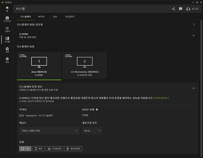 세 번째 '시스템 탭'은 3D 옵션을 제외한 모니터 디스플레이와 관련된 항목이다. 우선 눈에 띄는 것은 G-SYNC 항목이다. 예전 Window의 기본 설정이나 지포스 드라이버에서는 G-SYNC에 대한 세부 설정을 찾기가 어려웠던 게 사실이다. G-SYNC를 지원하는 모니터가 연결되면 자동으로 활성화되는 바람에 켜고 끄는 것 이외의 설정은 인지도가 낮은 편이었다. 하지만, 엔비디아 앱은 G-SYNC를 전체 화면에서만 가동시킬지 창 모드에서도 같이 가동시킬 지 선택할 수 있다. 또한 예전 엔비디아 제어판에 있던 해상도 조절과 새로고침 빈도 선택이 이 시스템 탭으로 옮겨왔다.