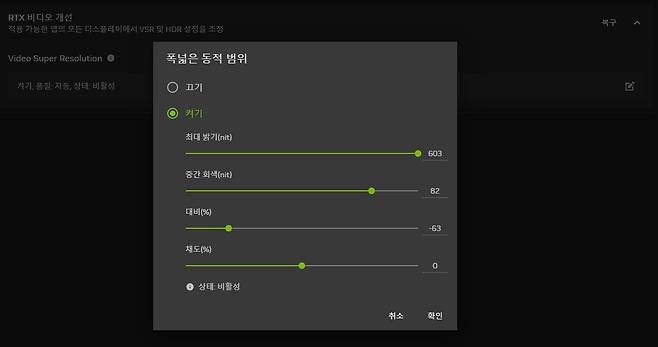 또 한 가지 주목할 점은 '폭넓은 동적 범위'다. 무슨 말인지 혼란스럽지만, High Dynamic Rage, 즉 HDR을 번역한 제목 같다. 말 그대로 HDR을 해당 모니터에서 재생되는 영상에 적용해 주는 메뉴다. 물론 WIndows 디스플레이에서 HDR이 활성화되어 있어야 한다는 조건이 있지만, 영상을 플레이하면서 직관적으로 HDR의 색상 조절을 할 수 있다는 장점이 돋보인다. 업스케일링 기술인 VSR과 꼭 병용하자.