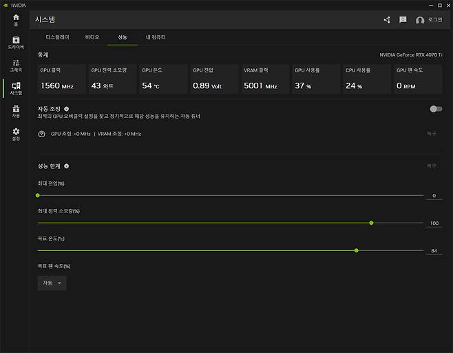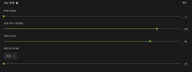 여기서 주목할 점은 '성능 한계' 서브 메뉴다. 일종의 소프트웨어 오버클럭이라 생각하면 쉬운데, GPU에 허용되는 최대 전압, 최대 전력 소모량, 목표 온도를 설정해 성능을 끌어올리거나 반대로 내릴 수도 있다. 또한, '목표 팬 속도' 기능은 자동으로 세팅된 팬 속도를 수동으로 전환이 가능하며 30~100까지 게이지를 통해 조절한다. GPU 온도가 70~80도 이상 올라가면 굉음을 내며 돌아가는 엔비디아 계열 그래픽카드의 쿨링팬의 속도를 별도의 추가 소프트웨어 설치 없이 제어할 수 있어 상당히 매력적이다.