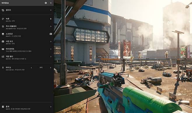 기존 버전에서 Alt+Z를 눌러 불러오는 오버레이 화면은 화면 상단에 아이콘 방식으로 배치되어 상당히 이질적이고 하위 메뉴를 불러오기가 불편했었다. 그와 달리 이번 엔비디아 앱은 Alt+Z를 누르는 순간 텍스트 위주 메뉴가 주 모니터 좌측에서 슬라이드 되어 나타난다. 마치 Windows의 시작 버튼을 눌렀을 때 나오는 메뉴처럼 상하 스크롤로 모든 항목에 들어갈 수 있고, 면적도 넓어져 사용이 한결 편리해졌다.