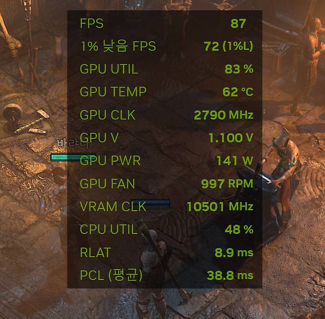 마지막은 통계 보기 기능이다. 통계 보기는 현재 플레이하고 있는 게임의 FPS, GPU 사용률, 온도, 전압 등을 실시간으로 모니터링해 수치로 제공한다. 또한 이 정보를 헤드업 디스플레이로 화면에 띄워주기까지 하는데 위치, 글꼴, 모양 등 세밀하게 사용자가 커스터마이징할 수 있다. 은근히 엔비디아에서 이런 실시간 헤드업 디스플레이를 제공한다는 사실을 모르는 사람이 많았다. 따라서 이런 FPS 카운팅 작업은 MSI의 애프터버너를 사용하곤 했는데, UI 셋팅하기가 꽤 까다로워 초보 사용자들이 쓰기엔 장벽이 높았던 게 사실이다.