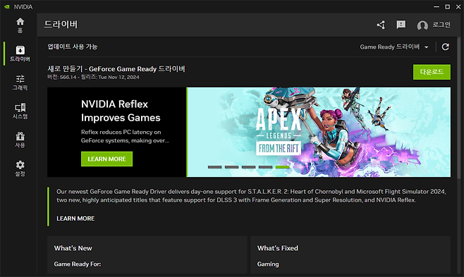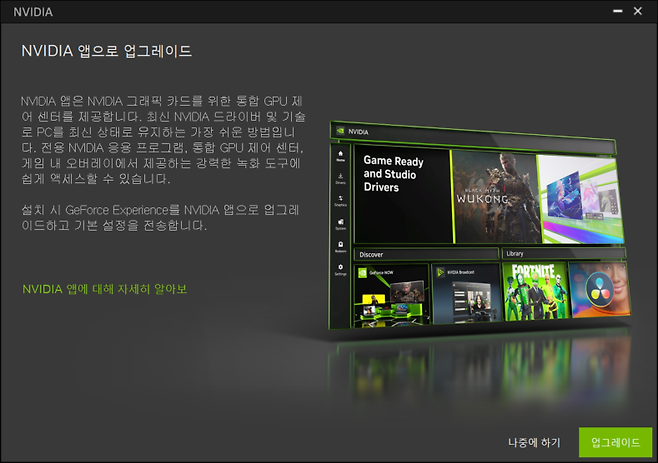 엔비디아 계열의 그래픽 카드 사용자라면 드라이버를 설치할 때 으레 지포스 익스피리언스까지 함께 깔게 된다. 하지만, 11월 12일 이후 지포스 익스피리언스나 엔비디아 제어판에 들어가면 업데이트 관련 대화창이 뜬다. 지시에 따라 버튼을 눌러가며 단계를 진행하면 설치는 금방 끝난다.