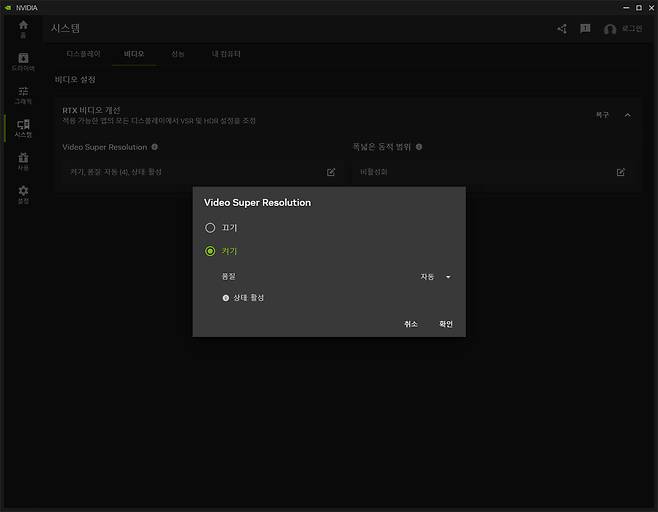 상위 비디오 탭을 누르면 RTX 비디오 개선이라는 메뉴가 나온다. 이는 RTX 계열 그래픽 카드만 지원하는 기술로 Video Super Resolution을 활성화시키는 항목이다. 이 기술은 브라우저 내 영상이나 영상 파일을 재생할 때 엔비디아 그래픽 카드가 자동으로 감지, 초당 프레임을 올려주거나 화질을 보정해 주는 기능이다. 1~4단계까지 보정 정도를 고를 수도 있으니 자신의 그래픽카드 스펙에 맞게 설정해 주자.