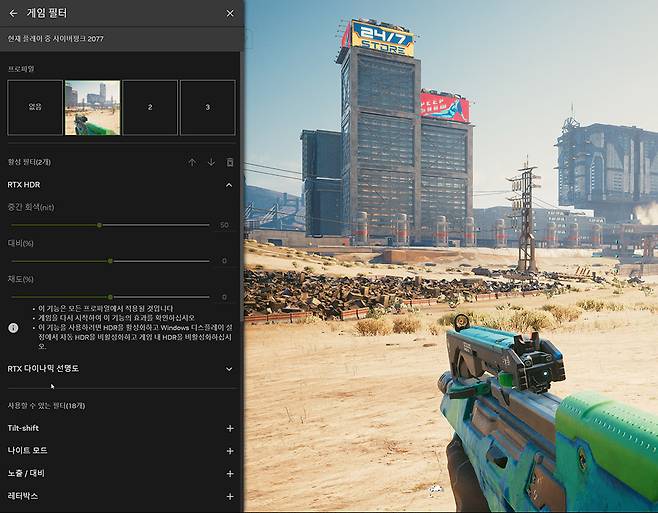 반면 정말 획기적인 기능이 추가되었다. 바로 '게임 필터' 부분이다. 한마디로 게임을 플레이하면서 화면 효과를 실시간으로 적용하는 것인데, RTX 다이나믹 선명도같이 화질 개선에 대한 옵션도 있지만, 흑백으로 전환하거나 레트로풍 필름 스타일 등으로 별도의 로딩 과정 없이 바로 전환할 수 있다. 스마트폰에서 카메라에 다양한 옵션을 주어 촬영하는 것을 게임에 그대로 적용했다고 보면 이해하기 쉽다.