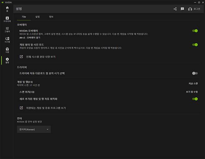 왼쪽 카테고리의 마지막은 '설정'이다. 비디오 캡처나 헤드업 디스플레이를 관장하는 오버레이 메뉴, 드라이버 메뉴, 해당 PC에 설치된 게임과 프로그램을 스캔하는 게임 및 앱 메뉴로 구성되어 있다. 이 중 주목할 것은 '오버레이'인데, 이번 엔비디아 앱에서 가장 중점적으로 기능이 강화된 항목이다. 물론 이 설정 창은 그 오버레이 기능을 켜고 끄는 항목밖에 없지만, 게임이나 Windows 상에서 Alt+Z를 누르면 화면 좌측에 한층 강화된 오버레이 창이 나타나게 된다.