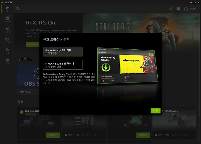 설치 후 처음 실행하면 선호 드라이버를 묻는 대화창이 나온다. 잘 알다시피 지포스 드라이버는 Game Ready와 NVIDIA Studio 버전으로 나뉜다. 자신의 용도에 맞게 게임과 크리이에션 작업으로 나누어 생각해 특화된 드라이버를 선택하면 된다. 더불어 그동안 지포스 익스피리언스는 무조건 로그인을 해야 세부 기능을 사용할 수 있었지만, 엔비디아 앱에 이르러서는 로그인 과정이 필수가 아니게 되었다. 물론 로그인을 하면 프로필이나 설정을 저장할 수 있는 장점도 있으므로 편의에 따라 로그인 여부를 선택하자.