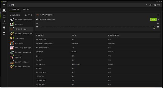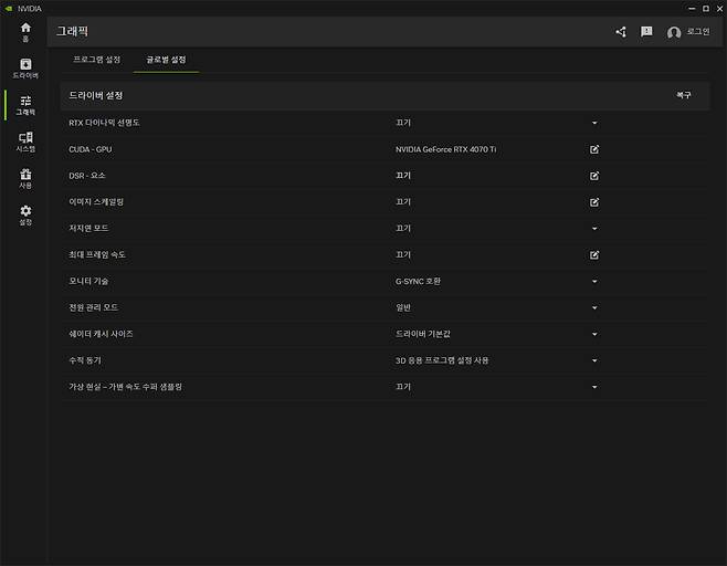 프로그램 설정 옆의 글로벌 설정은 예전 '전역' 설정의 명칭이 바뀐 듯 보인다. 말 그대로 프로그램마다 개별적으로 설정하는 것이 아니라 시스템 전체에 적용되는 설정으로 RTX 다이나믹 선명도, CUDA 등을 상세히 조절할 수 있다.