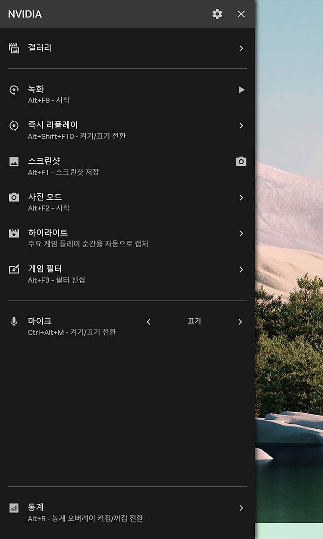 기존 버전에서 Alt+Z를 눌러 불러오는 오버레이 화면은 화면 상단에 아이콘 방식으로 배치되어 상당히 이질적이고 하위 메뉴를 불러오기가 불편했었다. 그와 달리 이번 엔비디아 앱은 Alt+Z를 누르는 순간 텍스트 위주 메뉴가 주 모니터 좌측에서 슬라이드 되어 나타난다. 마치 Windows의 시작 버튼을 눌렀을 때 나오는 메뉴처럼 상하 스크롤로 모든 항목에 들어갈 수 있고, 면적도 넓어져 사용이 한결 편리해졌다.