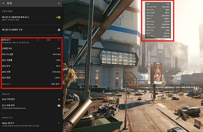 마지막은 통계 보기 기능이다. 통계 보기는 현재 플레이하고 있는 게임의 FPS, GPU 사용률, 온도, 전압 등을 실시간으로 모니터링해 수치로 제공한다. 또한 이 정보를 헤드업 디스플레이로 화면에 띄워주기까지 하는데 위치, 글꼴, 모양 등 세밀하게 사용자가 커스터마이징할 수 있다. 은근히 엔비디아에서 이런 실시간 헤드업 디스플레이를 제공한다는 사실을 모르는 사람이 많았다. 따라서 이런 FPS 카운팅 작업은 MSI의 애프터버너를 사용하곤 했는데, UI 셋팅하기가 꽤 까다로워 초보 사용자들이 쓰기엔 장벽이 높았던 게 사실이다.
