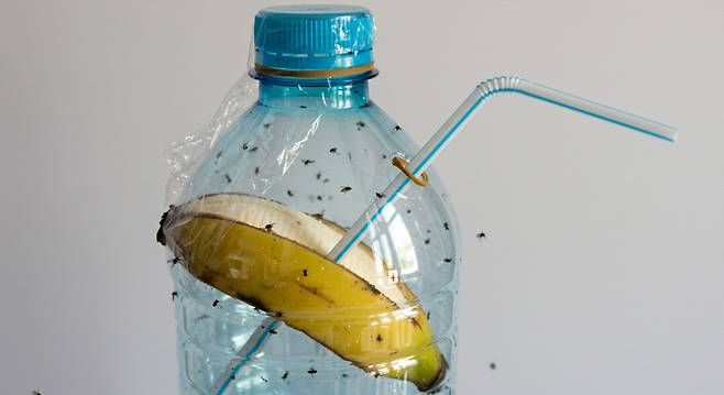 초파리 트랩은 성가신 초파리들을 잡을 수 있는 가장 간단한 방법이다. 준비물은 바나나 껍질, 빈 페트병, 랩, 고무줄, 빨대다. 먼저 바나나 껍질을 길게 찢어 페트병 안에 넣는다. 바나나 과육은 먹고, 남은 껍질만 활용하면 된다.