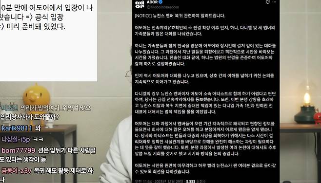 이진호는 이를 두고 "어도어가 사태의 책임 구조를 명확히 하면서도, 민지의 복귀 여부가 전체 판의 마지막 변수가 될 것"이라고 해석했다.
