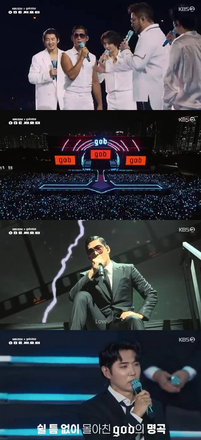 28일 방송된 KBS 50주년과 지오디 25주년을 기념하는 초대형 프로젝트 2023 KBS 대기획 'ㅇㅁㄷ 지오디'(이하 '지오디 콘서트')에서는 지오디가 희망과 위로를 건네는 무대를 펼치는 장면이 방송됐다.