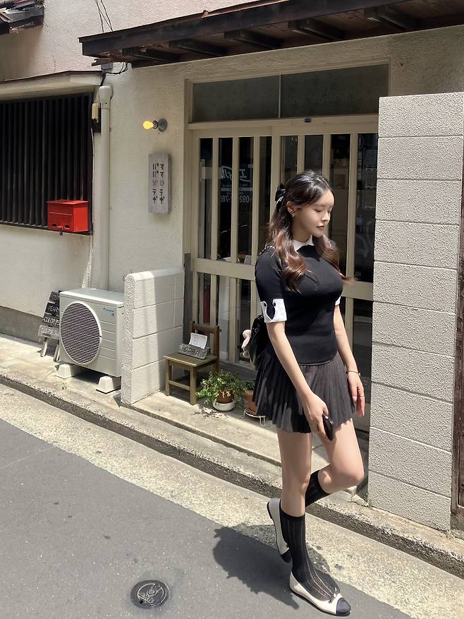 올블랙도 예쁘지만 스커트를 진한 그레이로 포인트를!