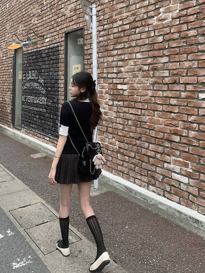 블랙 미니크로스백을 매줬는데 딱 제가 원하던 너무 귀여운 코디가 됐어요!♡