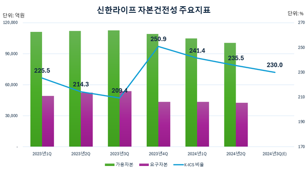 10일 보험 업계에 따르면 신한라이프의 올해 3분기 말 기준 K-ICS 비율은 230.0%로 잠정 집계됐다. 지난해 말부터 소폭 줄었지만 감소 폭은 다른 생명보험사에 비해 크지 않다. K-ICS 비율은 가용자본을 요구자본으로 나눈 것으로, 가용자본이 높아지거나 요구자본이 낮아지면 수치가 커진다.