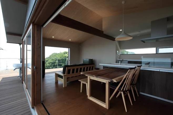 2층에 위치한 거실과 다이닝, 주방은 동쪽과 남쪽의 발코니로 둘러싸여 있어 집 안에서도 바다가 그대로 들어오는 느낌을 줍니다.