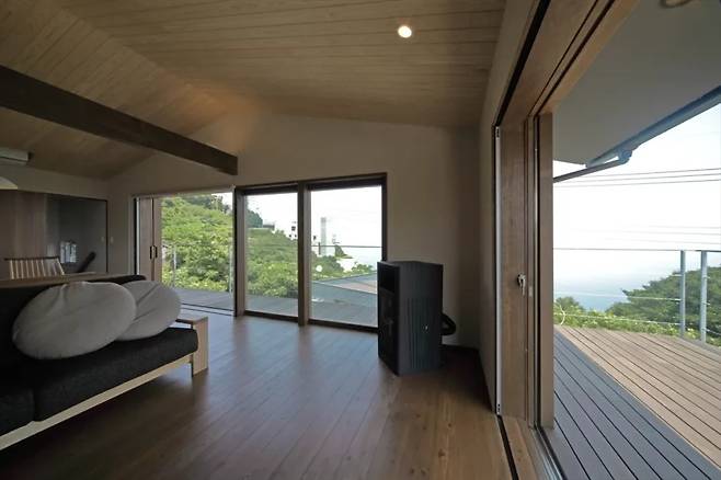 바다 바람을 견디는 구조 역시 이 집의 특징입니다. 갈바늄 합판 외벽과 삼각 지붕, 최소화된 서쪽 창문은 강풍에 대비한 전략으로, 실내에서는 바람 소리조차 들리지 않도록 설계되었습니다.