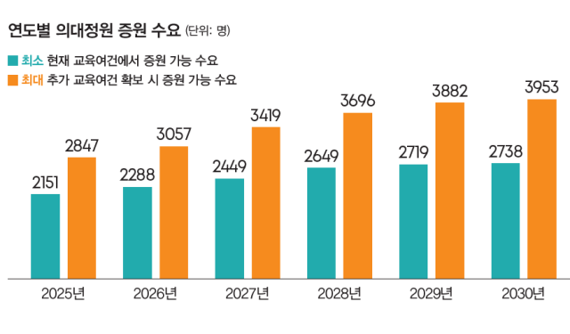 조사 결과에 따르면 전체 의과대학에서 희망한 2025학년도 증원 수요는 최소 2151명에서 최대 2847명이었습니다. 3058명인 현재 정원 대비 70.3~93.1%를 늘리자는 것입니다. 또한 각 대학은 정원을 지속적으로 확대해 2030학년도까지 최소 2738명에서 최대 3953명의 추가 증원을 희망했습니다.