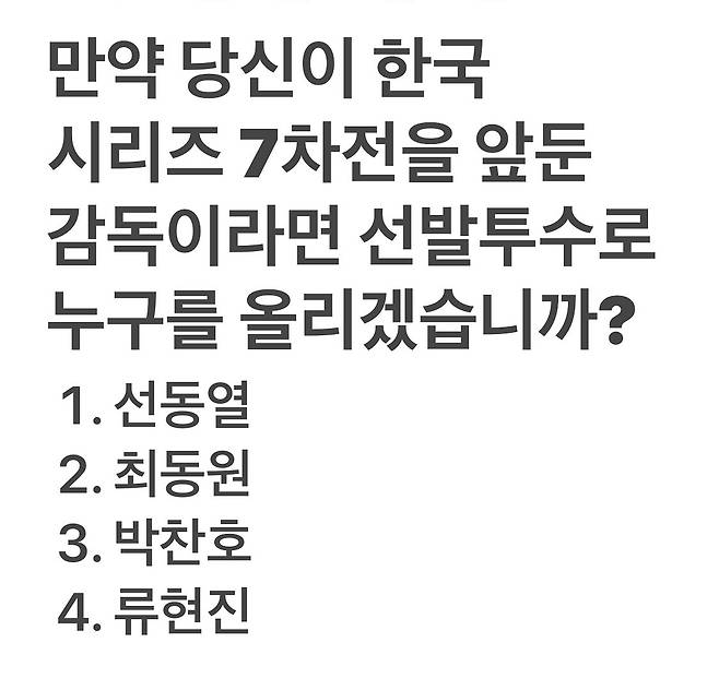반면, 커뮤니티쪽의 반응은 (제가 파악한 바로는) 류현진이 압도적이었습니다. 커뮤니티 주 이용층은 아무래도 이 논의를 역대 국내 최고의 투수인가로 바라보는 경향이 컸고, 단일시즌 한국 출신 투수로서 최고의 업적(MLB NL 평균자책점 1위)을 만들었던 ‘2019 류현진’이라면 당연히 그가 7차전에 어울린다고 생각하고 있었습니다.