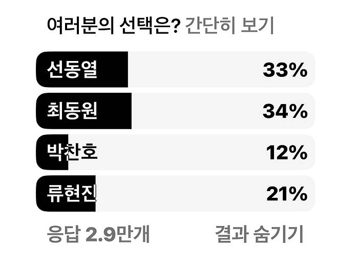 제 인스타 투표에는 29023분이 참여해 주셨고 최(34%) – 선(33%) – 류(21%) – 박(12%)의 순으로 득표가 진행되고 있습니다. 이 결과에 대해서 특별한 분석이 가능하지는 않겠지만 그래도 짐작을 해보면 제 인스타를 접하는 분들이 3040 남성팬들이 많아서가 아닐까 짐작합니다.