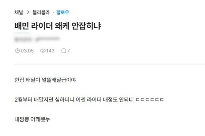 또 다른 누리꾼 역시 라이더 배정 불만 사항으로 인해 플랫폼에 대한 신뢰도가 무너졌다고 지적했다. 그는 “배민 요즘 라이더 엄청 안 잡힌다”라며 “이번에 받은 상품권만 다 쓰고 배달의민족을 지워야겠다”라고 밝혔다.