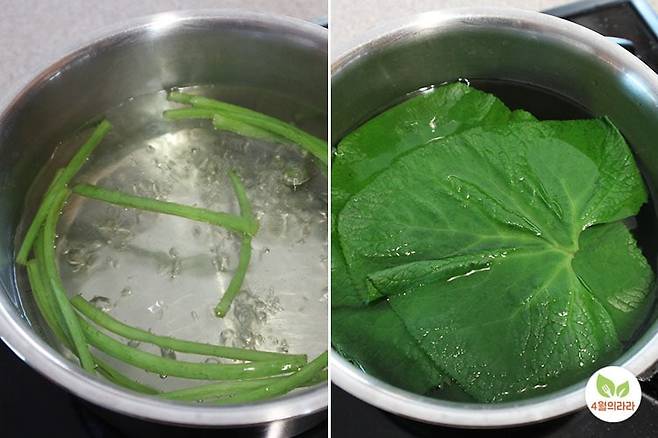 곧이어 이파리 넣어 부드럽게 데친 뒤 찬물에 헹구고 물기 제거
