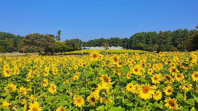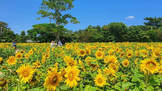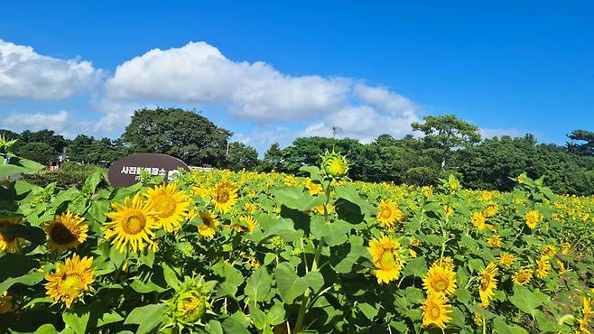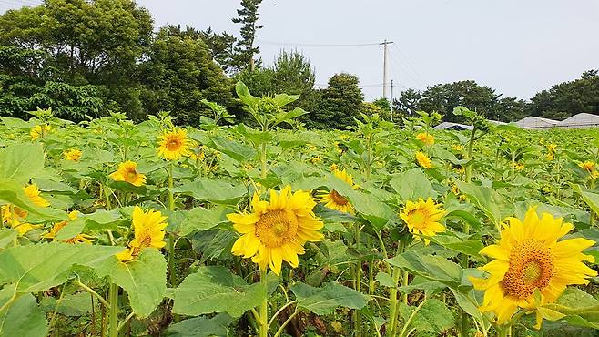 강렬한 제주 햇살 아래에서도 곳곳에 마련된 그늘과 바람 따라 흔들리는 해바라기가 특별한 여름 풍경을 연출한다.