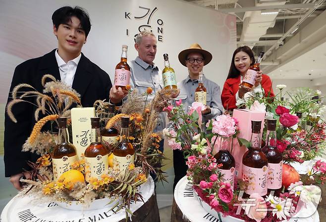 19일 서울 중구 보틀벙커 서울역점에서 모델들이 한국 최초 싱글몰트 위스키 기원, 시그니처 라인 3종(호랑이, 독수리, 유니콘)을 소개하고 있다.