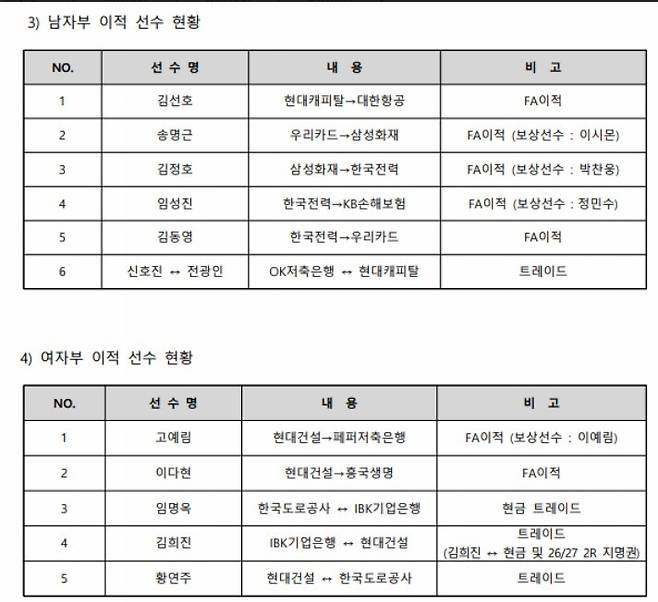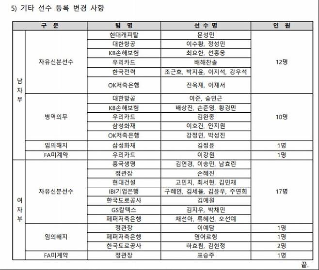 한편, 남자부 12명, 여자부 16명 등 총 28명의 선수가 자유신분선수로 등록되었으며 자유신분선수는 공시일로부터 정규리그 3라운드 종료일까지 어느 구단과도 자유롭게 계약을 맺을 수 있다. 자세한 선수 등록 관련 정보는 한국배구연맹 홈페이지(www.kovo.co.kr)에서 확인할 수 있다.