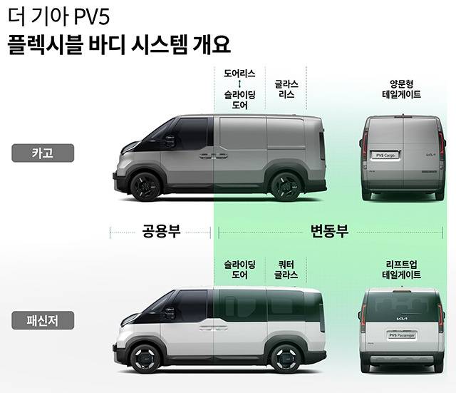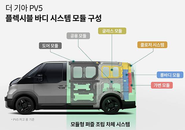 PV5는 전면부와 1열 구조를 모든 모델에서 공용화하고, 1열 이후의 후면부를 변동부로 설정해 모듈화된 차체를 자유롭게 조합할 수 있도록 설계됐다. 이를 통해 최대 16종의 바디 라인업 구성이 가능하며, 현재는 ▲패신저(롱) ▲카고 컴팩트(3도어/4도어) ▲카고 롱(3도어/4도어) ▲카고 하이루프(3도어/4도어) 등 총 7종이 우선 개발됐다. 예를 들어 카고 롱 모델은 카고 컴팩트에 ‘롱바디 모듈’을 추가하고 테일게이트나 쿼터 글라스 모듈만 교체하면 손쉽게 패신저 모델로 전환할 수 있다.