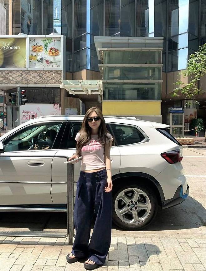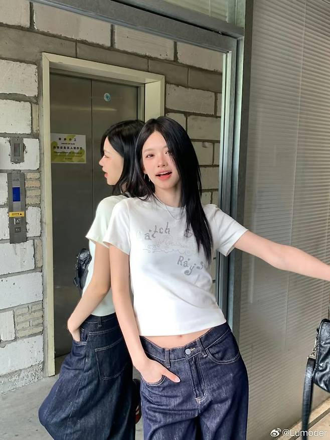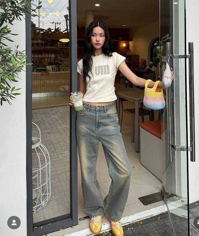 ✔ 화이트 크롭 티셔츠 + 연청 와이드 데님 + 쪼리 or 어글리 스니