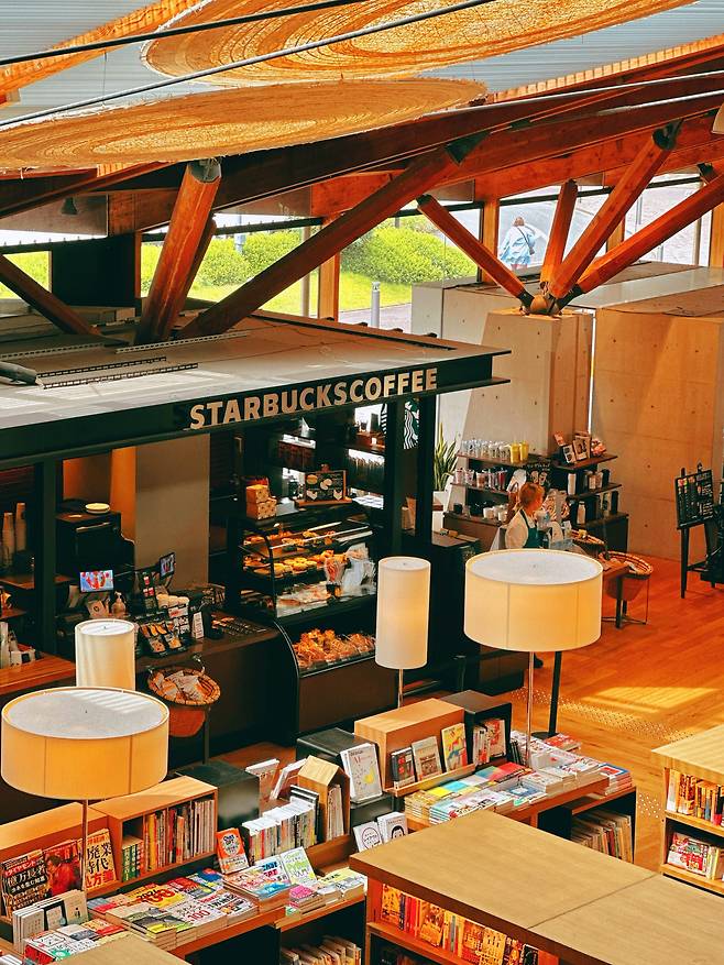 두 번째 장소의 주인공은 바로 '다케오'. 여행지에서 도서관을 보러 온 것은 사가 여행에서 처음 경험하는 일이었는데 우리나라의 별마당이 벤치마킹한 곳으로 잘 알려진 곳이기도 하다. 규모도 규모이지만 부드럽게 펼쳐지는 곡선 공간과 감각적이면서도 차분한 인테리어가 눈에 띈다. 천장까지 이어지는 책장을 보는 순간 압도 당하는 듯한 기분이 든다. 스타벅스가 입점해 있어서 커피와 함께 책을 읽으면서 쉬어갈 수 있는 곳이다. 어른, 아이 할 거 없이 정말 다양한 연령층의 시민들이 책을 읽거나 혹은 글을 쓰고 자기만의 시간을 보내고 있는 모습이 너무나도 인상적이었다.