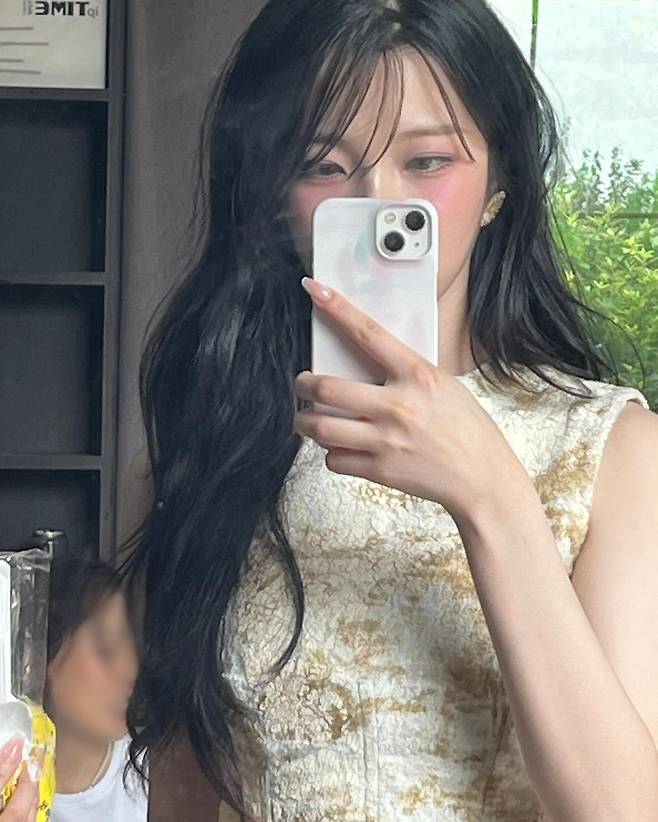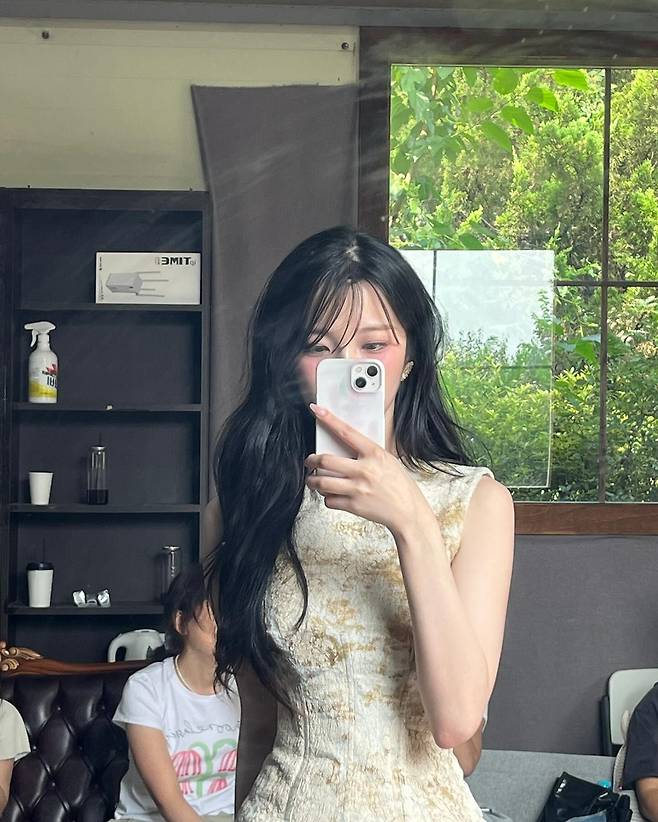 사진 속 배경의 푸른 창과 우아한 내부 인테리어는 그녀의 패션과 조화를 이루며, 마치 한 편의 화보 같은 느낌을 주었다. 그녀는 디테일 하나하나에 신경을 쓴 스타일링으로 플로럴 패턴의 정석을 보여주며 눈길을 끌었다.
