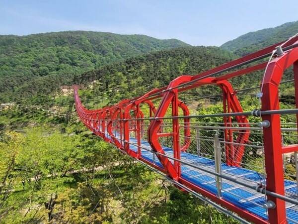 동의보감촌 남동쪽에는 무릉 계곡을 가로지르는 출렁다리 ‘무릉교’가 있습니다. 이 다리는 길이 211m, 높이 33m의 무주탑 현수교로, 내진설계 1등급에 초속 38m 강풍에도 견딜 수 있도록 설계되어 있어요.
