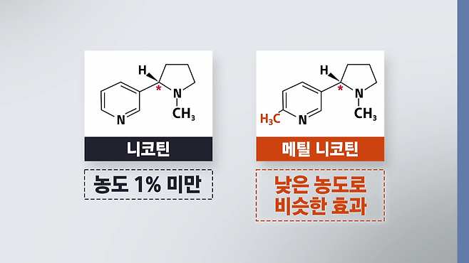 신호상 국제특성분석연구소 고문은 "중추신경 흥분 효과나 중독성을 실험해서 니코틴과 유사한 특징을 갖고 있는 것을 골라낸 게 바로 메틸 니코틴"이라고 설명했습니다.