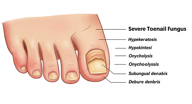 - 전이영양성(TDO): 발톱무좀이 장기간 지속되어 발톱 전체가 두꺼워지고 부서진 상태