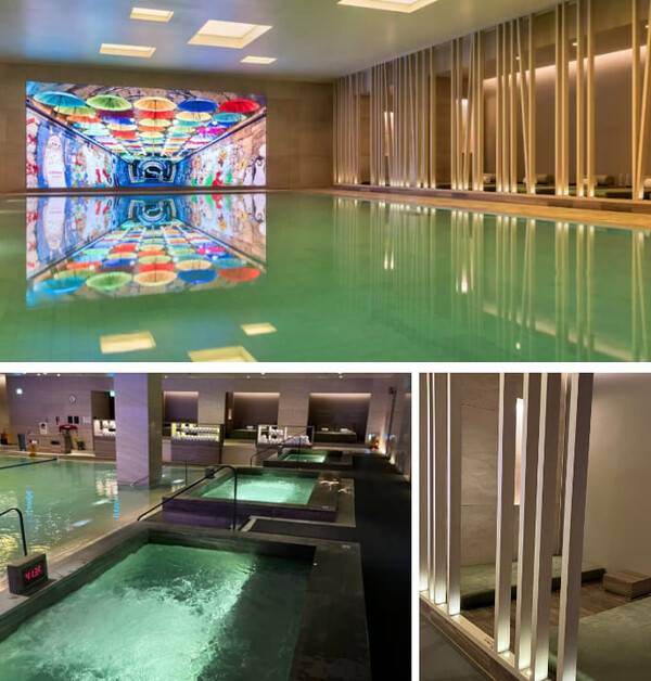 파란색 수영장 바닥, 거울로 된 천정, 샹들리에 등등 갖가지 요소가 조화롭게 펼쳐져 마치 하늘에 떠있는 듯한 느낌까지 주는데요. 수영 후에는 작은 자쿠지에서 몸을 녹이며 피로까지 풀어보시길 강력히 추천드립니다.