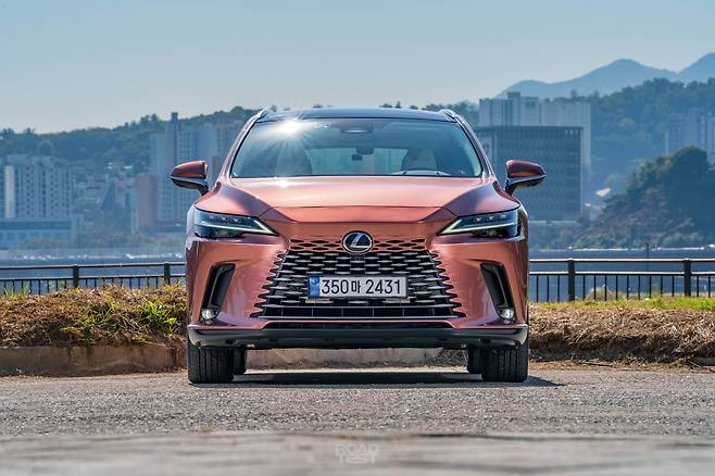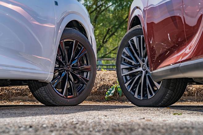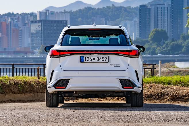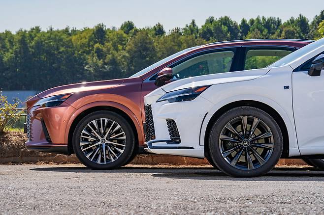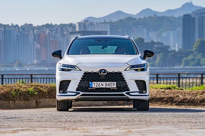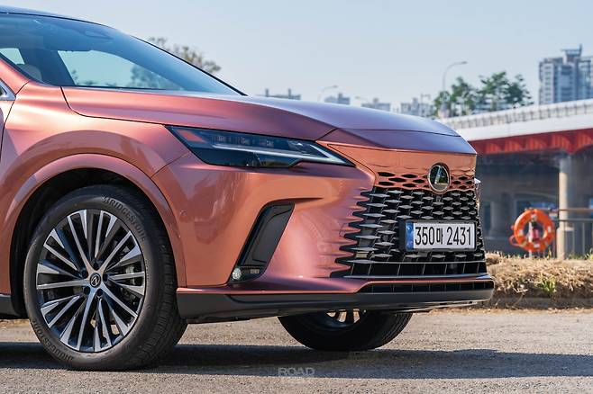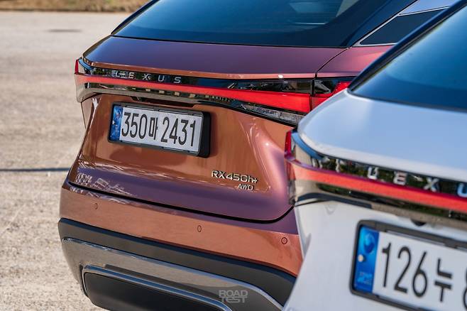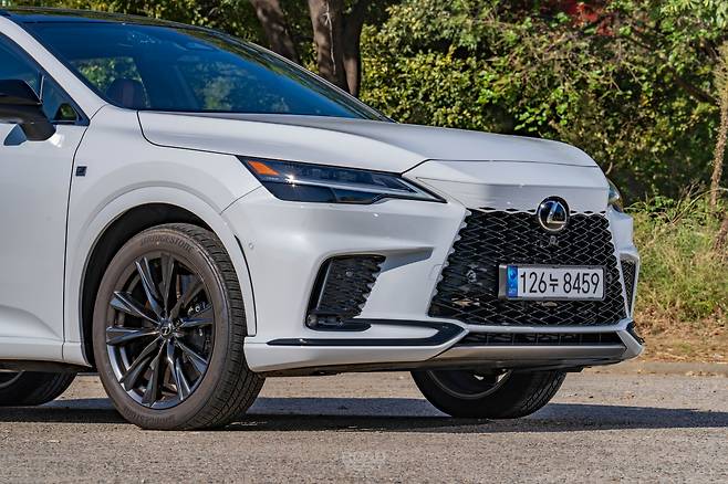 오늘 만난 두 대의 RX, 450h+와 500h는 외모에서 풍기는 분위기가 꽤 다르다. 450h+는 차분하면서 RX 고유의 ‘덩어리감’을 강조했다. 500h는 F 스포츠 디자인 패키지 덕분에 더 매콤하다. 그릴 속을 블랙 유광 컬러로 채우고, 앞뒤 범퍼도 좀 더 공격적인으로 다듬었다. ES 또는 LS의 SUV 버전 같았던 중후함의 대명사가, 이젠 NX처럼 젊고 역동적으로 변했다.