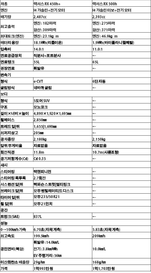 RX는 이전 세대보다 가격이 올랐지만, 여전히 경쟁력은 높다. 일반 하이브리드인 RX 350h가 9,870만 원, 플러그인 하이브리드 모델인 RX 450h+가 1억993만 원, 고성능 하이브리드인 RX 500h는 1억1,703만 원이다.