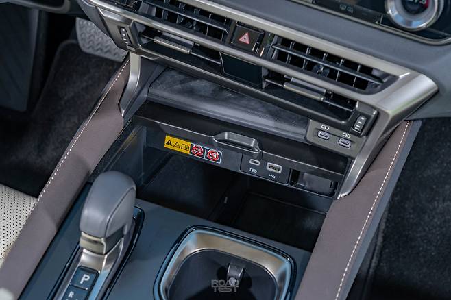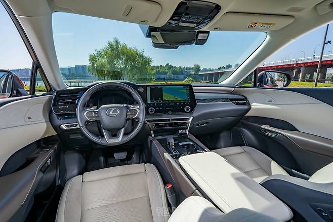 실내는 최신 렉서스 디자인 테마를 수혈 받았다. 커다란 14인치 고화질 모니터와 계기판이 운전자를 에워싼 구조다. 대시보드와 도어트림은 욕조처럼 아늑하게 연결하고, 무드램프는 일본 전통가옥의 조명처럼 은은하게 밝힌다. 최신 U+ 드라이브로 구동하는 인포테인먼트와 21개 스피커로 구현한 마크레빈슨 프리미엄 오디오, 앞좌석에만 총 4개의 USB 포트(C타입 3개, A타입 1개)를 갖춘 점도 눈에 띈다(뒷좌석은 C타입 2개). 다만, 크라운 등 토요타 일부 제품과 같은 스티어링 휠과 기어레버 디자인은 차별화가 아쉽다.