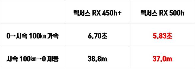 반면, RX 500h는 효율보단 성능 중시 하이브리드로 보는 게 맞다. 2개의 전기 모터를 탑재했지만, 뒤 차축에 자리한 구동 모터는 동력을 상시 뒷바퀴에 전달한다. 모터 사용 비중이 많다보니, 자연스레 엔진은 전륜 모터를 통해 배터리를 채우느라 바쁘다. 따라서 450h 만큼 빼어난 효율을 뽑아내는 건 어려웠다. 공인연비가 10.0㎞/L에 불과한 이유다. 다만, 450h+와 동일한 코스를 이동하며 기록한 연비는 리터당 15~16㎞ 수준으로, 유럽 브랜드의 MHEV보단 효율이 괜찮았다.