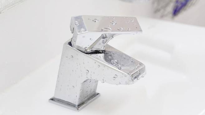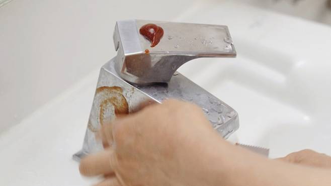 마지막! 수도꼭지 물때 제거하기. 물때가 끼기 쉬운 수도꼭지에 미리 케첩으로 바르세요. 최대한 골고루 발라 주시면 됩니다. 그리고 10분 정도 기다리세요.