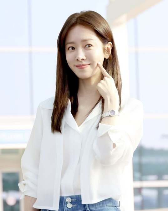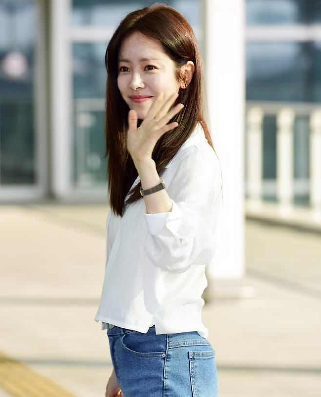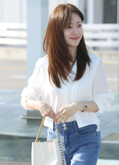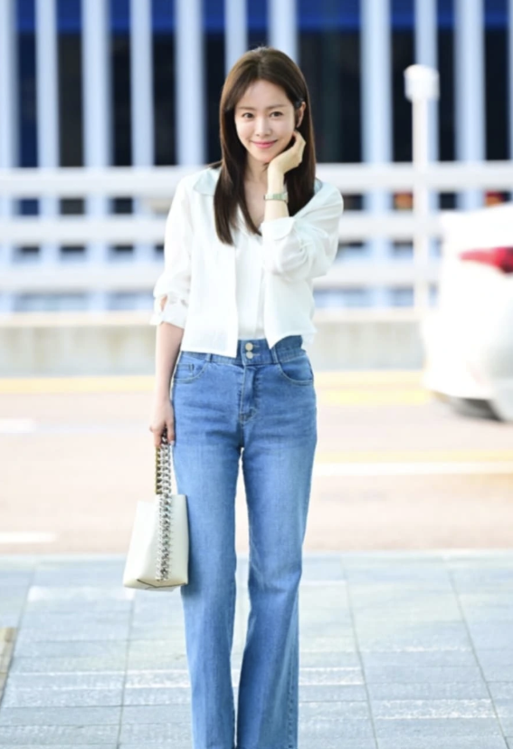 공항패션에서는 데님 팬츠에 화이트 블라우스로 청순한 공항패션을 연출했다면..
