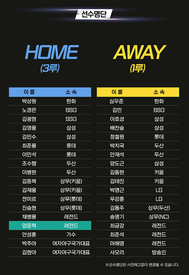 현역선수, 레전드, 여자야구 국가대표, 연예인까지~~ 우와~~