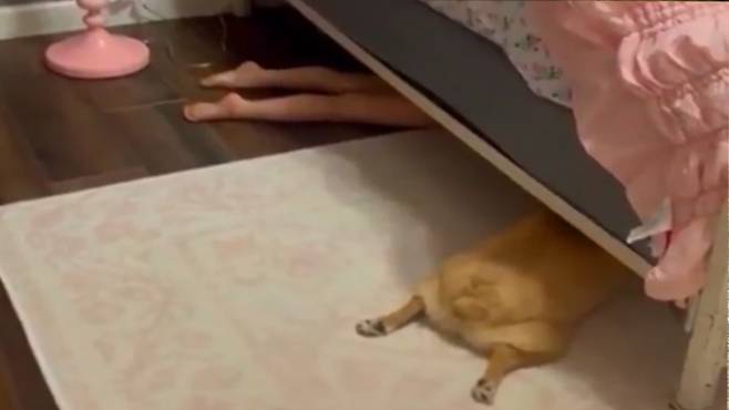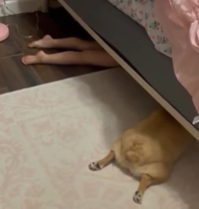 두 친구는 보호자를 놀라게 하겠다며 침대 밑으로 쏙 들어갔지만, 정작 발과 엉덩이를 두고 나오는 바람에 은신 시도는 시작부터 실패 느낌이 짙었다. 침대 밖으로 쏙 드러난 아이의 발, 그리고 바로 옆에 붙어 있는 코기의 통통한 엉덩이와 짧은 다리는 보는 순간 웃음을 자아낸다.