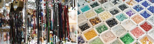 동대문종합시장 DIY 붐을 불러일으킨 액세서리 매장들은 여전히 인기다.실버나 주물 등 금속부터 원석, 진주까지 없는 재료가 없는 액세서리 만물상에서 기본 부자재만 구입해두면 목걸이나 팔찌 몇 개는 뚝딱 만들 수 있는데, 완제품을 사는 것보다 가격이 정말 저렴하다. 완성품 역시 일반 매장보다는 저렴하니 마음에 드는 디자인이 있다면 놓치지 말자.
