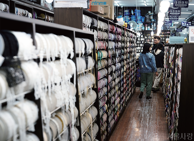 카디건이나 코트의 단추를 바꾸고 싶을 때, 심심한 옷에 레이스나 끈 같은 장식을 더하고 싶을 때 보물 창고와도 같은 이곳은 바로 동대문종합시장 B동 1층이다. 옷 만드는 취미를 갖고 있다면 지나칠 수 없는 곳으로 지퍼, 단추, 끈부터 가죽과 모피까지 의류 부자재를 원 없이 구경하고 구매할 수 있다. 최근에는 기존 옷에 더해 로맨틱한 느낌을 살려주는 레이스 장식이 유행이다.