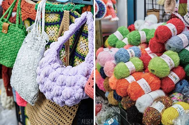 동대문역 9번 출구에서 JW 메리어트 동대문스퀘어 서울 호텔과 동대문종합시장 지하상가로 연결된 입구로 들어서면 뜨개실과 뜨개 작품이 가득한 A동 지하 1층 통로를 만나게 된다. 매장 안쪽에는 뜨개질하는 사람들이 옹기종기 앉아 있다. 실만 사면 바로 뜨는 법을 알려주고, 도안까지 주는 이들이다. 뜨개질을 하다 막히면 가져와 배우면서 뜰 수도 있다.