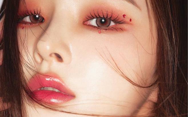 지속력이 뛰어난 입큰 ‘클리어 핏 파운데이션’을 바른 다음 컨실러로 잡티를 커버하고, 파우더를 코 옆, 팔자주름, 눈썹 뼈 등에 부분적으로 사용했다. 입생로랑 ‘꾸뛰르 컬러 클러치’ 사하리엔느와 에이블랙 ‘글램 체인지 멀티 팔레트’ 10호 올댓 로즈로 눈가에 레드를 입히고 펄 섀도를 더해 반짝임을 추가한다. 입술은 입큰 ‘퍼피 글로우 틴트’ 05 애플콕을 바른 뒤 맥의 블랙 립글라스를 더해 톤을 다운시키고 롬앤 워터 글로스로 탕후루 립을 완성했다.